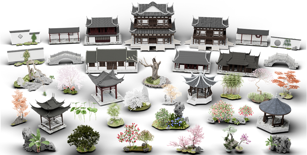 GardenVerse construction from Internet repositories and manual modeling. We invite experts to modify the architectures and construct object combinations. Finally, garden experts annotate the basic information and garden knowledge for assets.