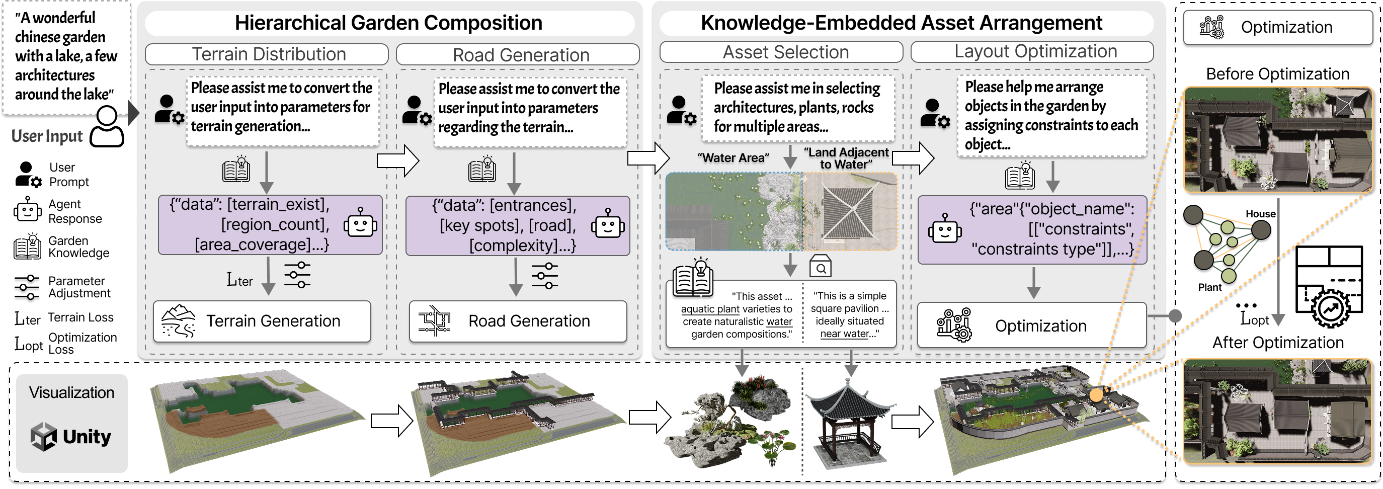 Overview of the GardenDesigner pipeline. GardenDesigner transforms the user input into a Jiangnan garden through Hierarchical Garden Composition and Knowledge-Embedded Asset Arrangement. First, Hierarchical Garden Composition transfers the user input into parameters for terrain and road generation with aesthetic principles. Subsequently, Knowledge-Embedded Asset Arrangement resolves garden asset selection and relational constraint-based layout optimization for each area: (1) Asset Selection chooses the objects based on the garden knowledge and area information; (2) Layout Optimization assigns the object according to garden knowledge, and then optimization loss is used to get the feasible solution for the garden layout.