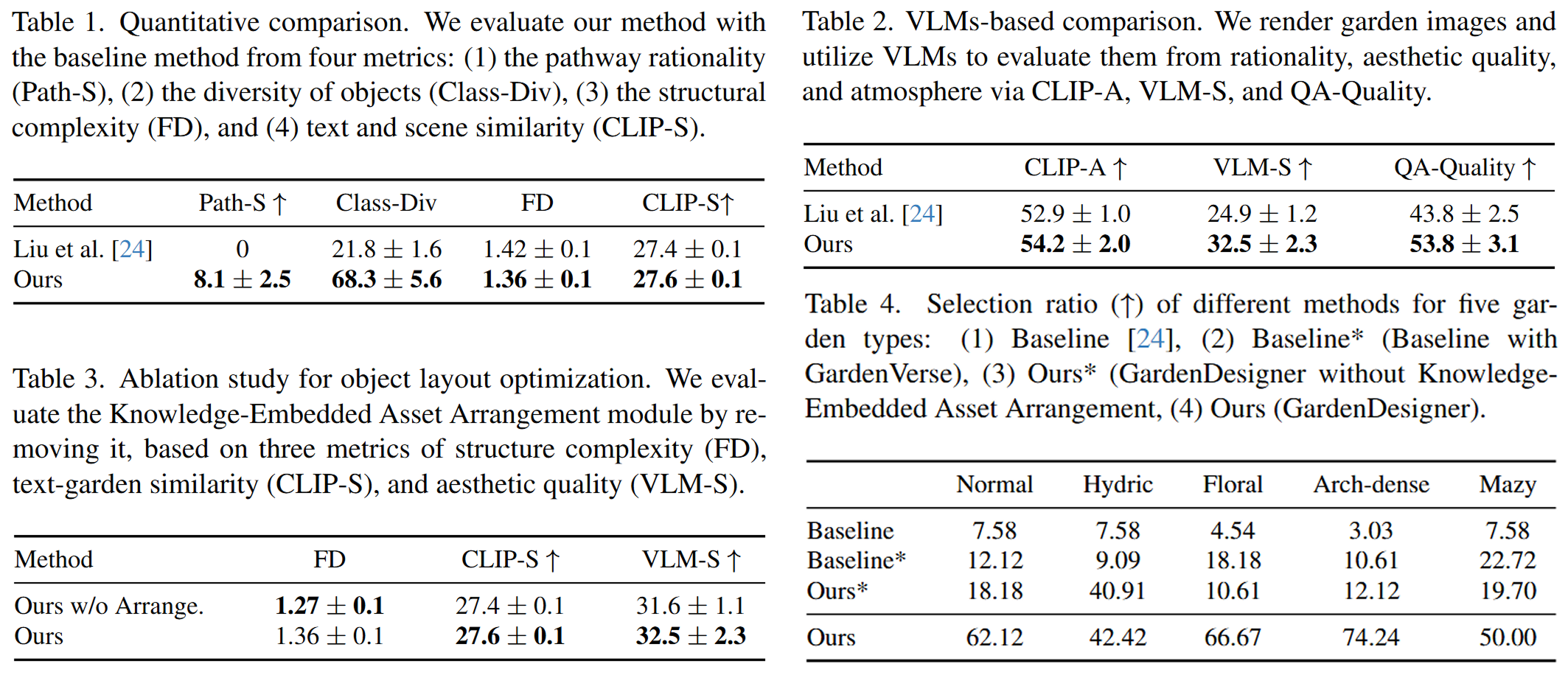 We evaluate generated Gardens from physical plausibility, structure complexity, semantic coherence, and aesthetic quality. 1. Pathway Score (Path-S). Path-S is used to determine whether significant plants and buildings can be reached or viewed along the road. 2. Class Diversity (Class-Div). Additionally, we also use Class Diversity to measure the object categories' diversity. 3. Fractal Dimension (FD). We calculate structure complexity. 4. CLIP-Score is used to measure the consistency between the generated garden and the instruction. And the garden type prompt template is in the form of ''a top-down view of Jiangnan garden scene feature.'' 5. CLIP-Aesthetic is used to evaluate the aesthetic score. 6. VLM-Score. We prompt the VLMs to rate the rendered garden image. 7.QA-Quality. We also used VLM-based visual scorer Q-Align to evaluate results.